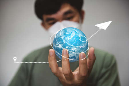 globe earth with insulating mask as hat. Safe tourism.
