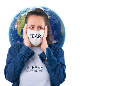 Planet earth map on protective face mask isolated on white background. Global pandemic COVID 19 disease protection against coronavirus, new normal concept