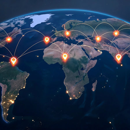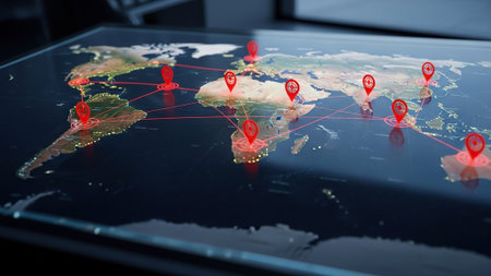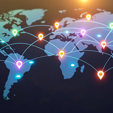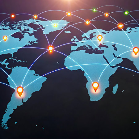 A Digital map with location markers and illuminated connections