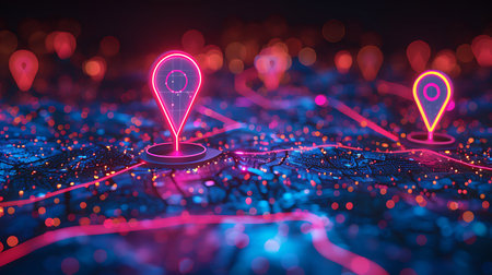 A captivating image featuring a glowing geolocation marker set against a vibrant, illuminated city map at night, showcasing a blend of modern technology and urban aesthetics.