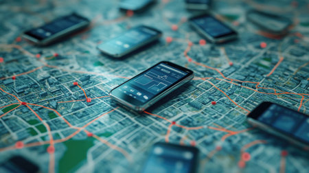 A captivating display of smartphones showcasing digital maps amid a dynamic urban landscape, emphasizing modern navigation and connectivity.
