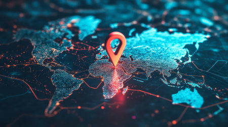 Explore an artistic representation of a digital world map, featuring a striking location pin marking Europe amidst a network of vibrant connections and data flow.