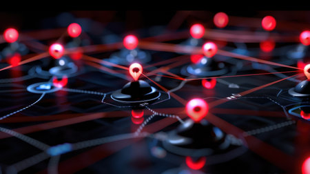 A striking representation of a digital network featuring red pins connected by lines, illustrating data connections and communication in a modern tech landscape.