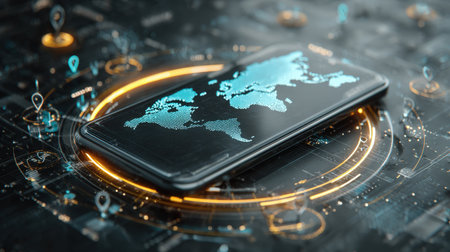 A smartphone surrounded by a holographic world map and location pins, illustrating a futuristic global positioning system with a glowing tech interface and realistic details.