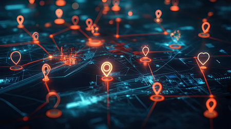 A futuristic digital grid with glowing blue lines connecting numerous red location pins, creating a sense of interconnectedness and data flow.