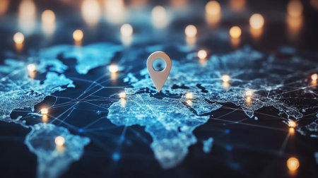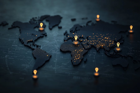 An abstract world map featuring digital location pins representing connectivity and navigation in a modern, tech-inspired design. Ideal for various themes.