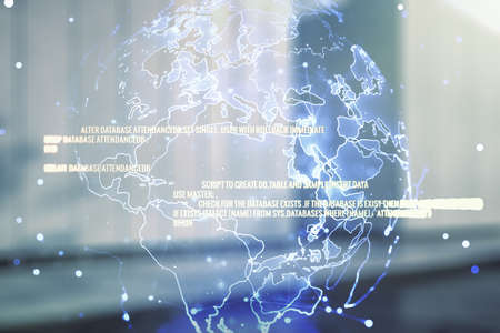 Abstract virtual coding concept and world map hologram on blurry modern office building background. Multiexposure