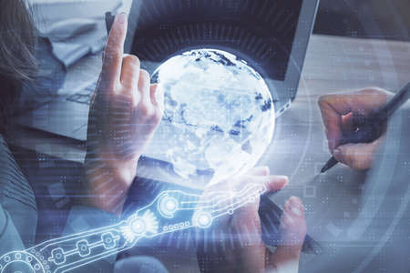 Double exposure of man and woman working together and technology theme world map drawing hologram. International business tech concept. Computer background.