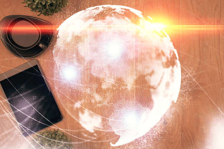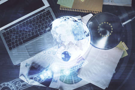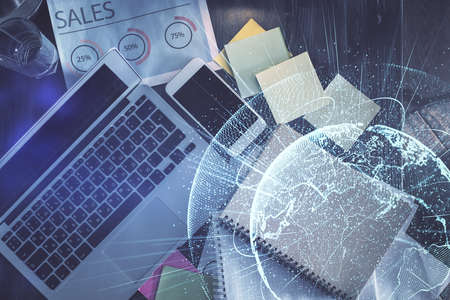 Multi exposure of technology theme drawing over work table desktop. Top view. Global data analysis concept.