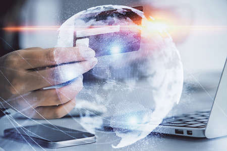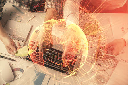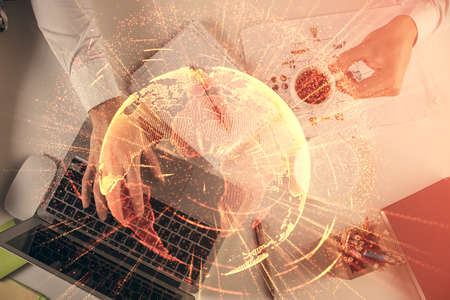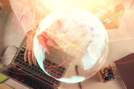 Abstract creative digital world map and hands typing on laptop on background, globalization concept. Multiexposure