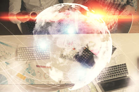 Double exposure of map hologram drawing over study table background with computer. Concept of international network. Top view.
