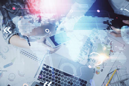 Double exposure of business theme hologram over desktop with phone. Top view. Mobile international trade connection concept.