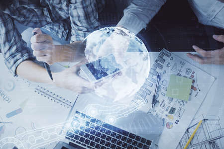 Double exposure of map drawing and man and woman working together holding and using a mobile device. planet tech concept.