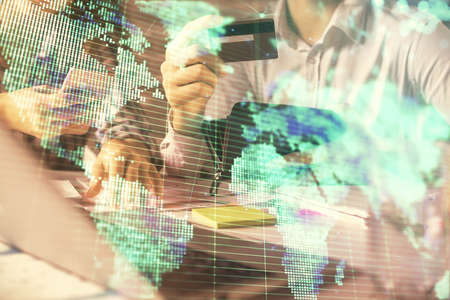 Double exposure of man and woman on-line shopping holding a credit card and business theme hologram drawing. E-commerce pay on-line concept.