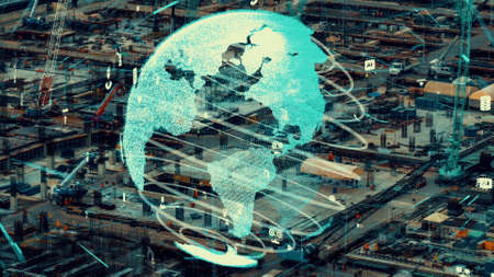 Construction technology concept with alteration graphic over construction site showing concept of automation and remote wireless machine control by using futuristic HUD in a computer software .