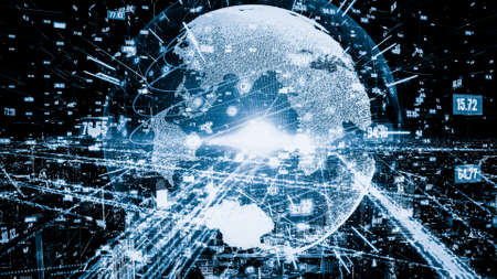 Futuristic global network and tacit digital data transfer 3D graphic . Concept of smart digital transformation and technology disruption that changes global trends in new information era .