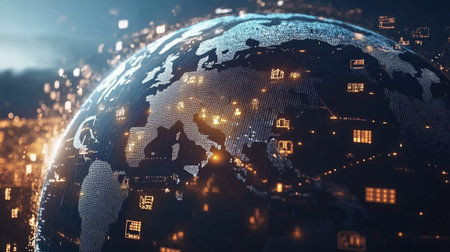 This captivating image depicts a world map intertwined with digital data elements, showcasing the global network and technological advancements. Ideal for themes of exploration and connectivity.