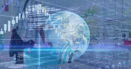 Image of diverse data processing over globe. global connections, technology and digital interface concept digitally generated image.