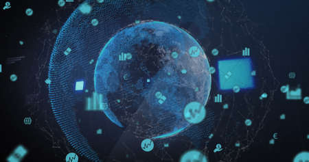 Image of network of connections with icons over globe. Global connections, data processing and digital interface concept digitally generated image.