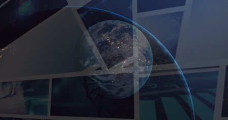 Abstract hi tech background with digital planet hologram and picture thumbnails. Concept of internet, communication and hi tech. Toned image double exposure