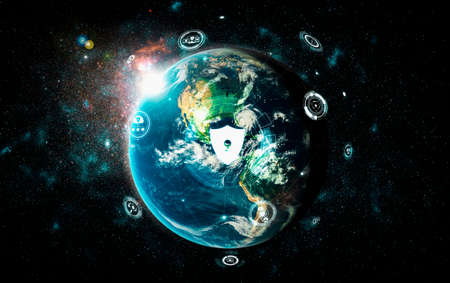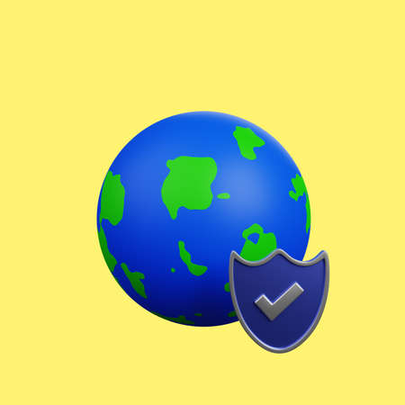 Conceptual 3D illustration of the abstract planet Earth behind a futuristic shield. Low poly style. Blue geometric background. Wireframe connection structure. Contemporary 3D graphic design concept.