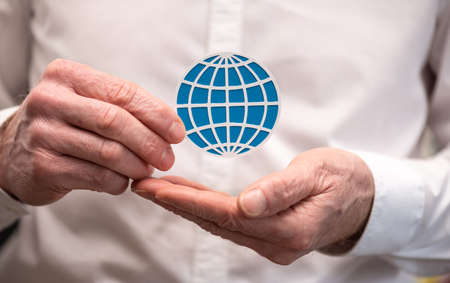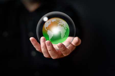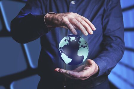 The globe Earth in the hands of man. Concept on business, politics, ecology and media. Earth day abstract background