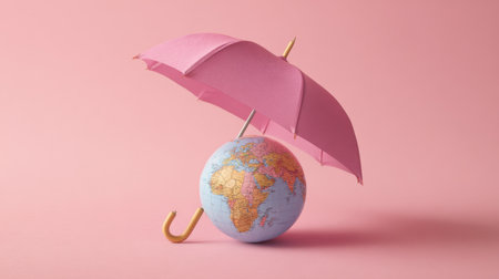 An artistic representation of an umbrella protecting a globe, set against a soft pink background. This image symbolizes global awareness and environmental protection themes.