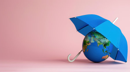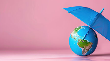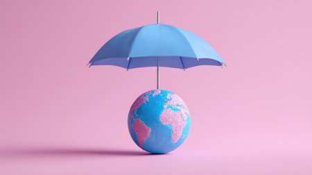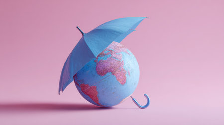A vibrant composition featuring a blue umbrella positioned over a globe, set against a soft pink background. This image symbolizes protection, care, and the urgent need for global environmental awareness and sustainability efforts.