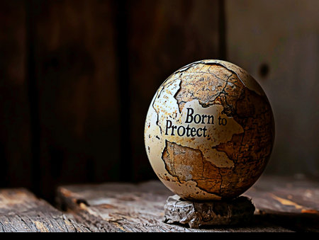 AI Generated - Globe sitting atop a wooden table, with the words born to protect written on it. Commercial illustration artwork for business applications. High resolution. Premium quality.