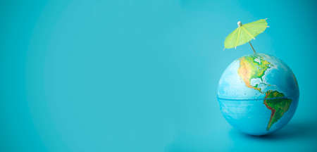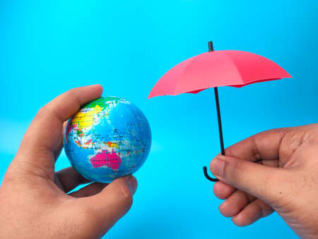 Global warming and climate change on earth concept. Earth globe on a blue background with an umbrella. Protecting the atmosphere from ultraviolet radiation and ozone holes