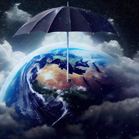 A vibrant blue umbrella shelters a globe, symbolizing protection and sustainability in the face of climate change. Ideal for environmental campaigns.
