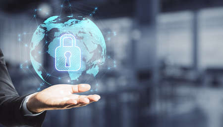 Close up of hand holding abstract glowing globe hologram with security padlock icon on blurry office interior room background with mock up place for your advertisement. Protection, data and technology concept. double exposure