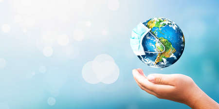 Globe with a face mask in the hands of a person in medical gloves on a gray background