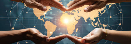 A group of people stand holding hands in front of a world map, creating a unified gesture of connection and cooperation