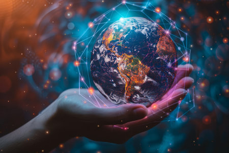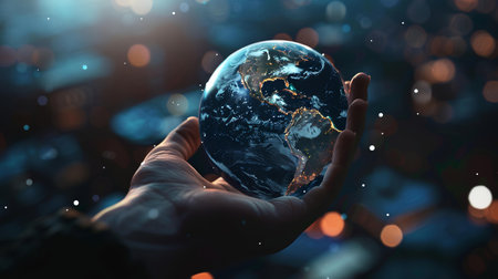 A captivating image of a hand holding a glowing Earth, with illuminated continents set against a dark cosmic background, representing global awareness.
