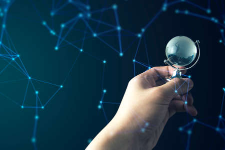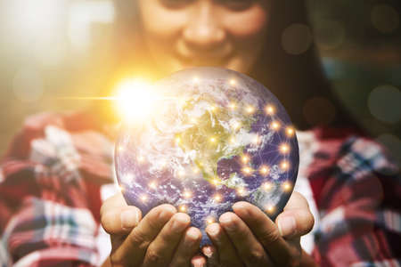 A woman's hand was holding a globe and there is a light spot that is connected in a network. Environment concept and world guardian organization. Earth image courtesy of NASA.