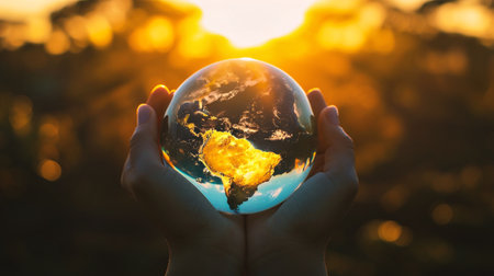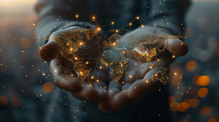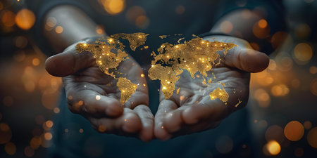 Person gently cradles a luminous Earth globe that radiates golden light, symbolizing global interconnectedness. The detailed map of the world reflects cities and continents, evoking thoughts of unity, technology, and progress. Generative AI