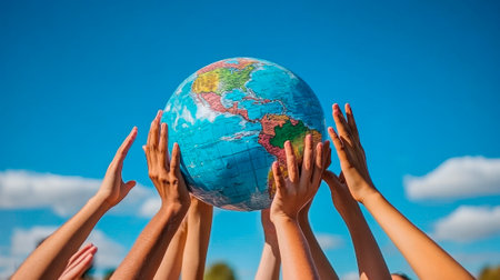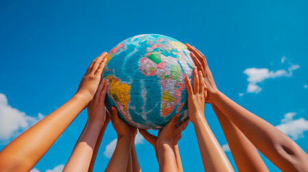A stunning image showing diverse hands lifting a globe against a bright sky, symbolizing unity and cooperation in a global community striving for a better future.