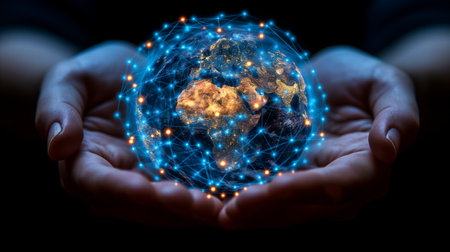 A human hand gently cradles a transparent, glowing blue globe, showcasing illuminated digital continents and intricate network lines across its surface.