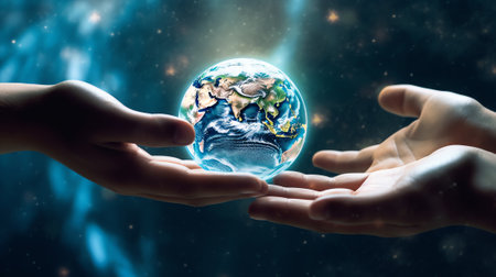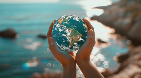 Two hands hold gently a detailed depiction of Earth, showing its blue oceans and green continents. Generative AI