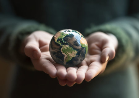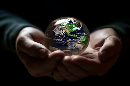 A hand cradles a miniature Earth globe, a vibrant sphere of blue and green, set against a dark backdrop. The composition features soft lighting, highlighting the world's continents and oceans. This image, with its conceptual symbolism, is suitable for various commercial uses related to global issues.