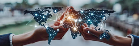 Hands presenting a digital globe with glowing network connections against a blurred background. Digital transformation and global connectivity in a technological world.