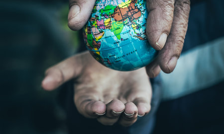 Hands from different cultures and ethnicities jointly holding the Earth, promoting diversity and unity