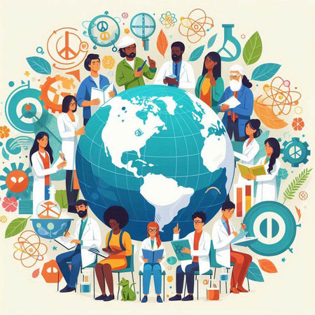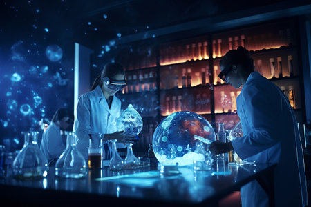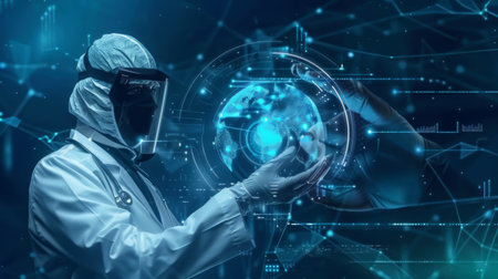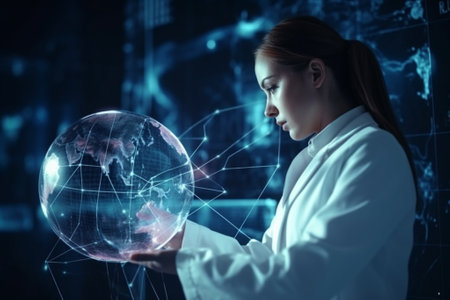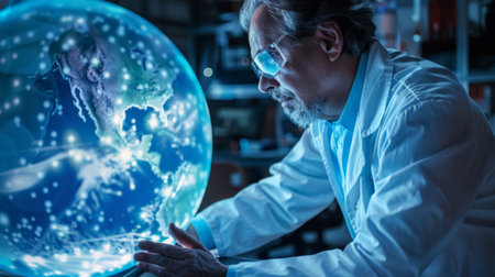 Scientist closely examining a holographic representation of Earth in a high-tech lab, symbolizing technological advancement and global research. Ideal for themes of science and innovation