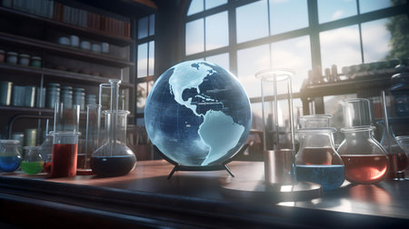 Globe on laboratory table. Science, chemistry and technology concept. 3D Rendering