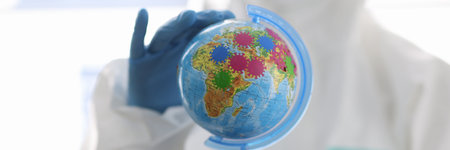 Hands of doctor in protective suit are holding globe.
