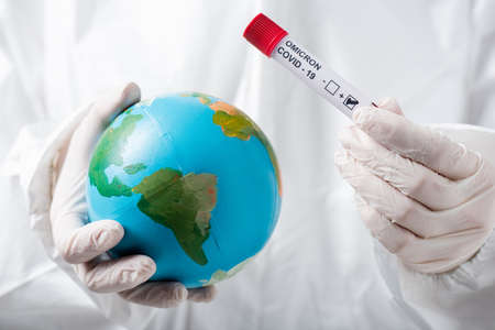 partial view of scientist in hazmat suit and latex gloves holding globe and positive covid-19 omicron variant test