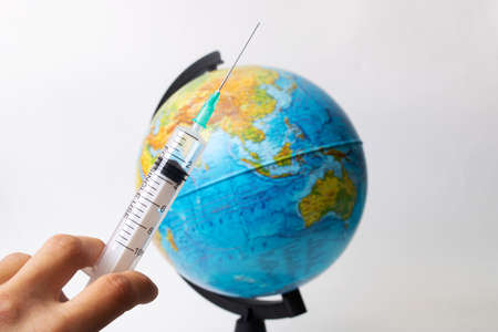 Syringe in hand on the background of the globe