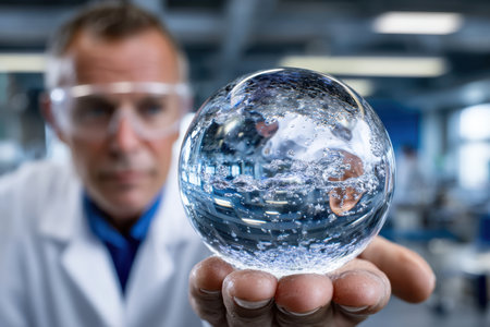 A scientist in a lab coat carefully examines a clear globe filled with water, showing casing experiments.