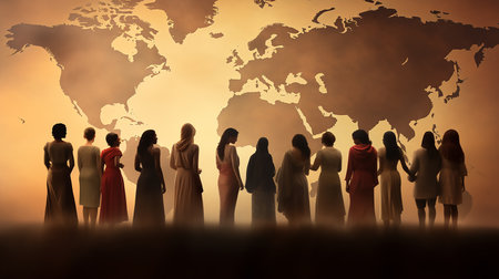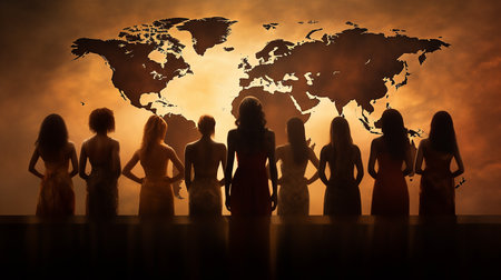 This artistic portrayal features an array of women from diverse cultures, illuminated by vibrant colors, symbolizing unity and resilience across different backgrounds and regions of the globe.